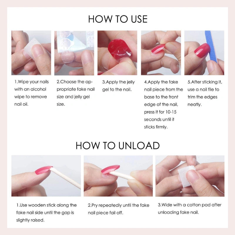 No appointments, no mess. Just choose your size, apply the adhesive tabs or glue, press on, and go. Each set includes 24 pieces in 12 sizes, so you can find your perfect fit in minutes — beginner-friendly and easy to customize.