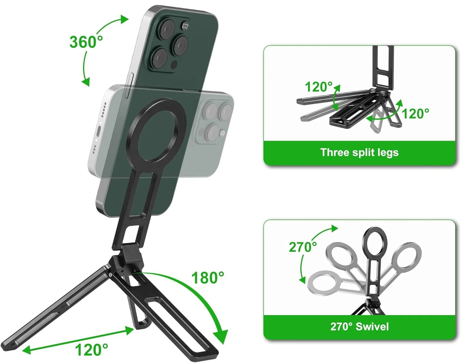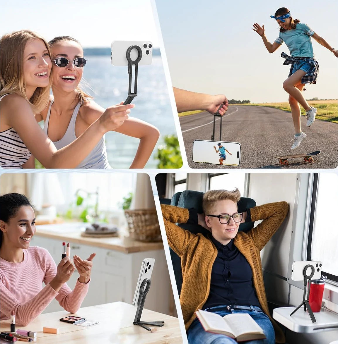 This compact dual-sided magnetic tripod works as both a desk stand and a handheld phone holder. Snap your phone on instantly and switch between video calls, selfies, or filming with ease.